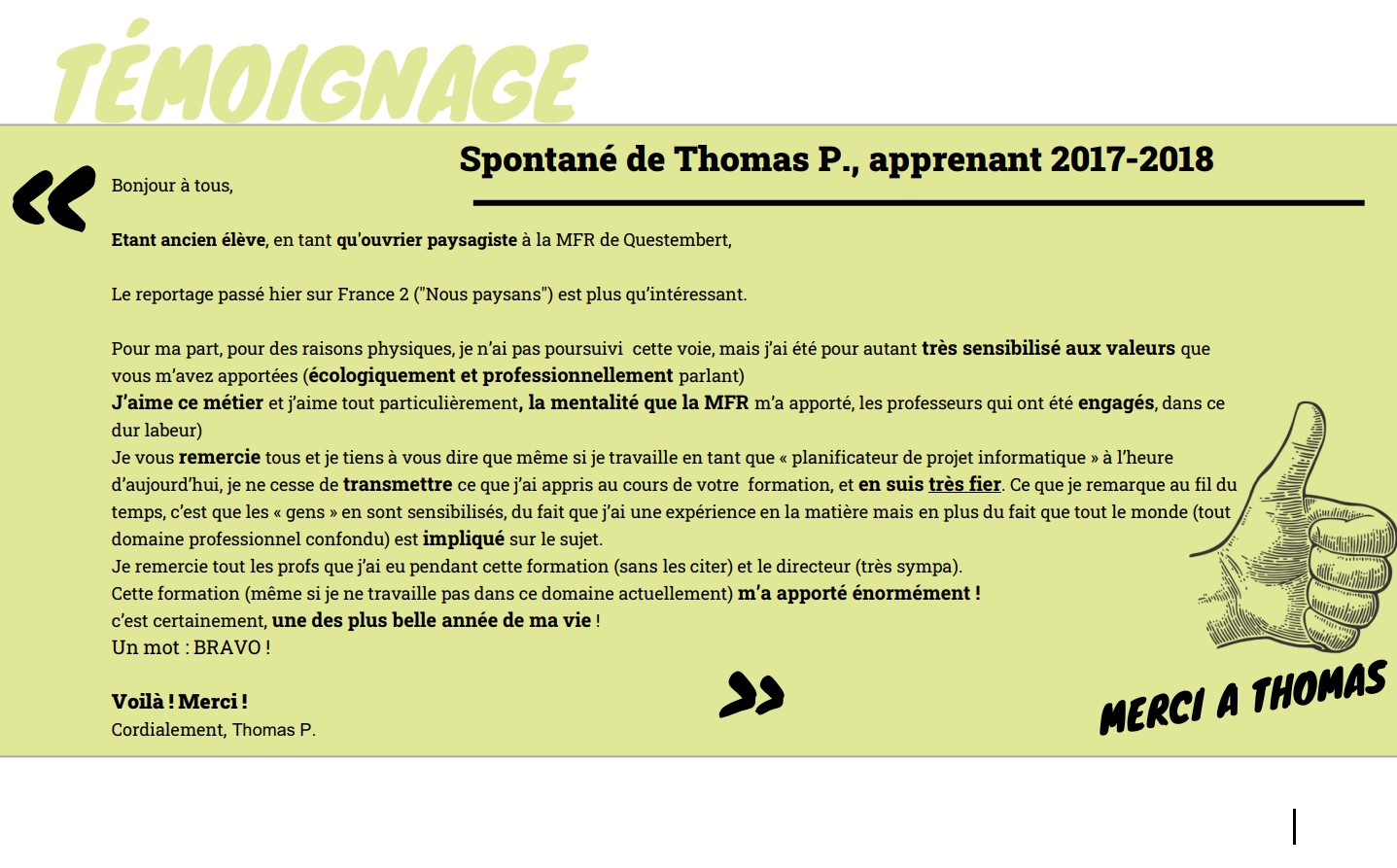 Je garde un bon souvenir de la MFR et j’ai gardé des contacts avec 2 anciens camarades de promotion. D’ailleurs, je reviens régulièrement faire des démonstrations auprès des jeunes de la 4ème au BAC Pro à la MFR de Questembert.